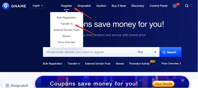 Second, login your Gname account, click the navigation bar [Register] - [Transfer in] - [Bulk Transfer in] to enter the bulk transfer page.