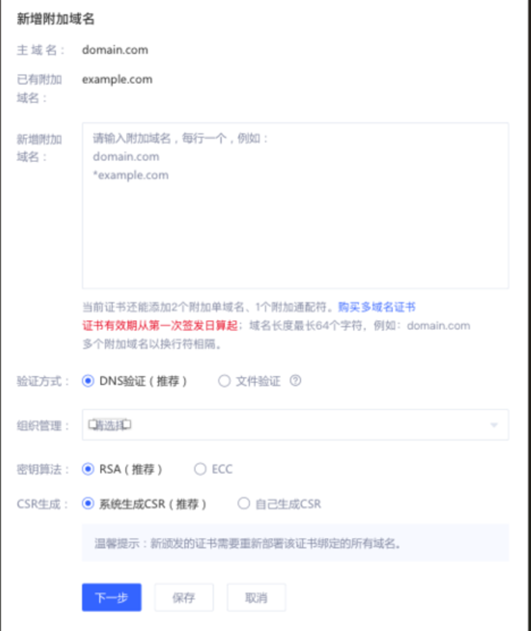 * After the newly added additional domain name is reviewed and the certificate is issued, the new certificate can be downloaded. The original certificate will no longer be available for download. Users need to save the original certificate by themselves. This site is not responsible for the retention of the original certificate.