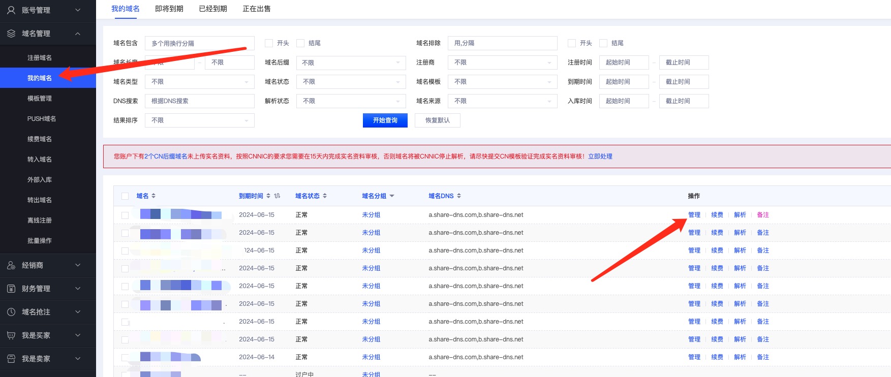 3、在域名列表页面,单击目标域名右侧操作列下的管理。
