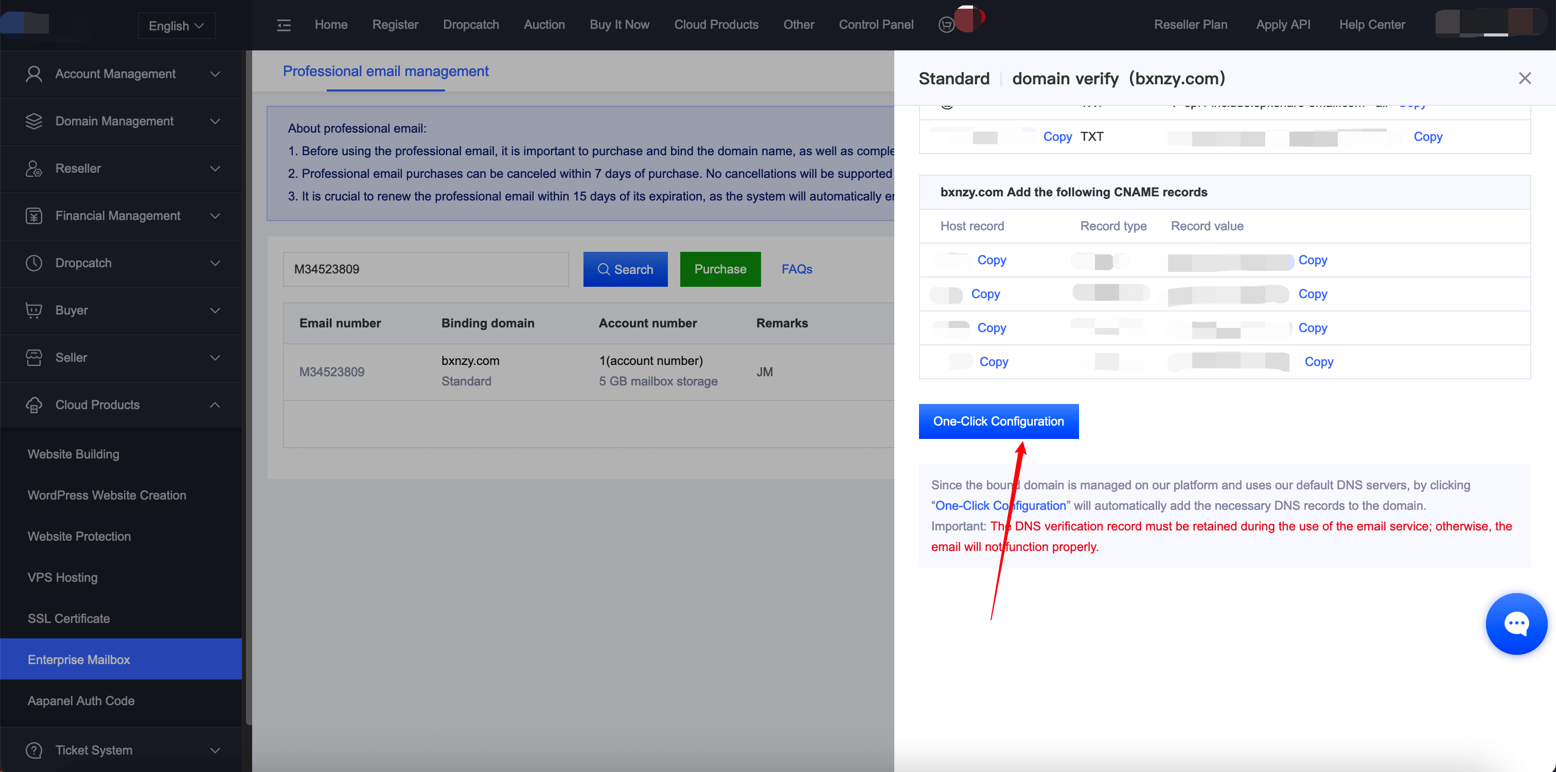 D. On the domain verification page, click "One-Click Configuration." Once DNS verification is successful, you can start using the service.