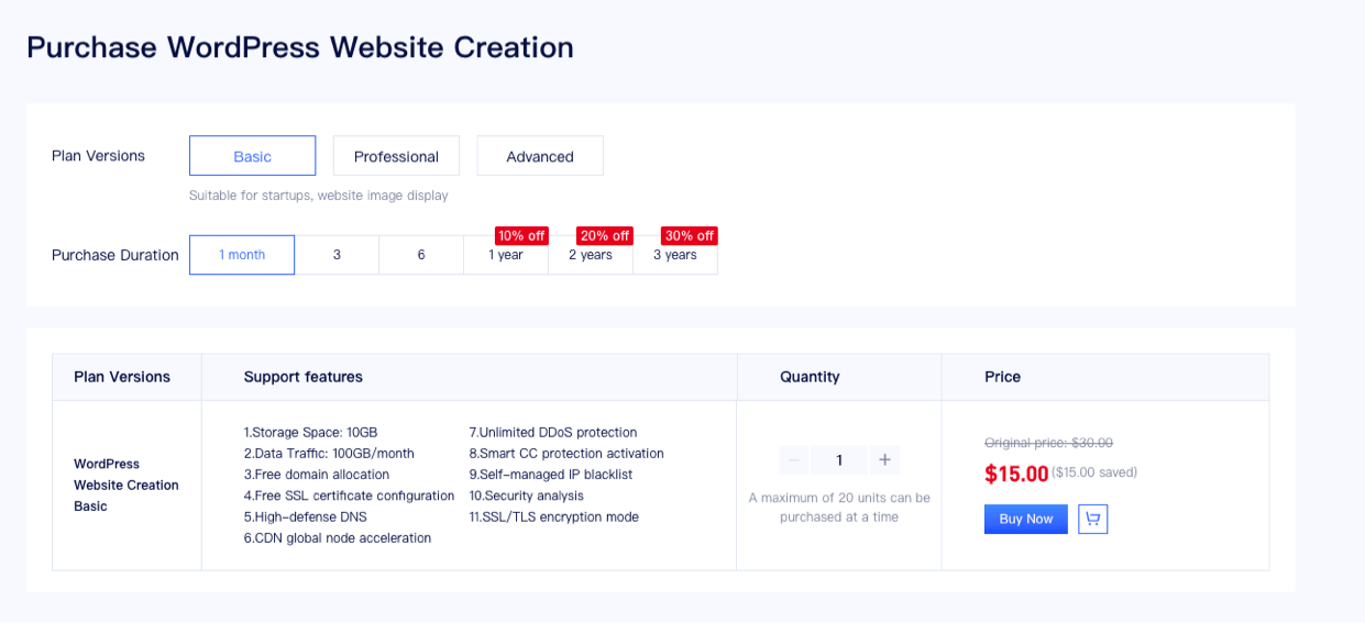 3. On the purchase page, select the WordPress website package you need.