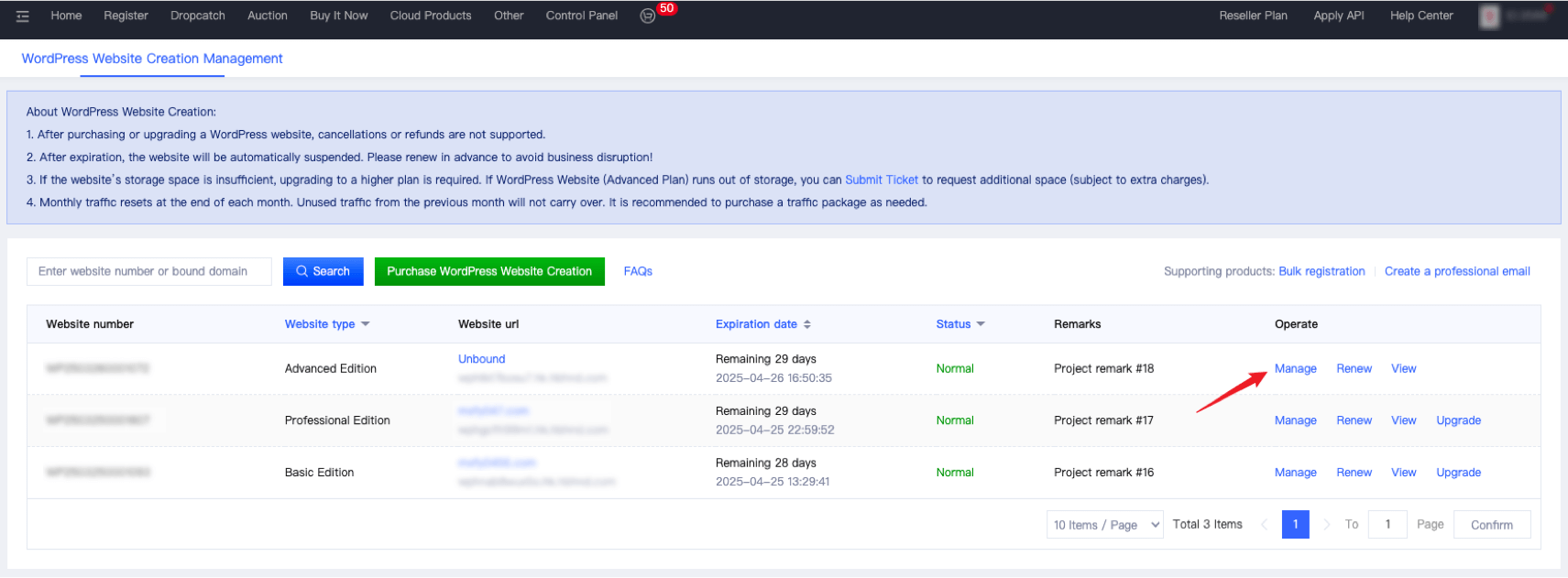 4. After purchase, the system will assign a domain for use, and you will enter the WordPress website management page. Click “Manage” to edit your website content.