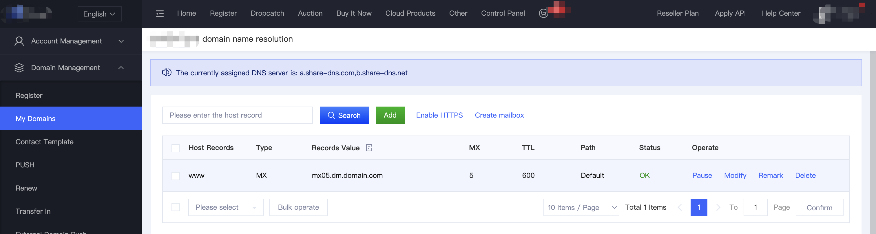 1. Upon login, click into [Domain Management], follow by [My Domain], and click into the [Resolution] on the right side of the intended domain name. Click on the green button “Add”.