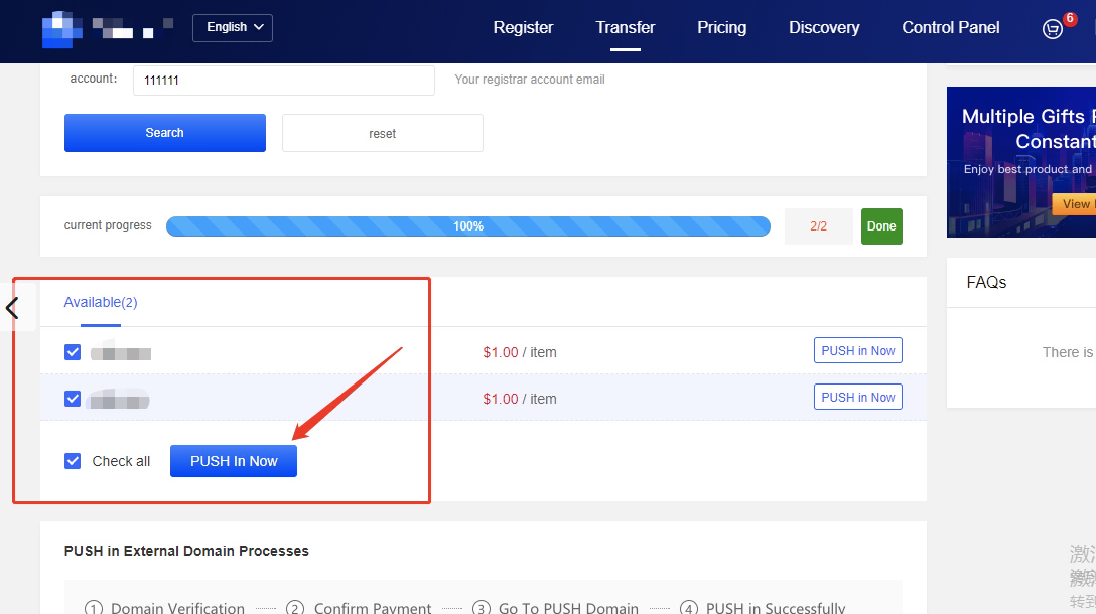 1.Login your Gname account, click on the navigation bar [PUSH in External Domain], enter the page of [Bulk PUSH in].