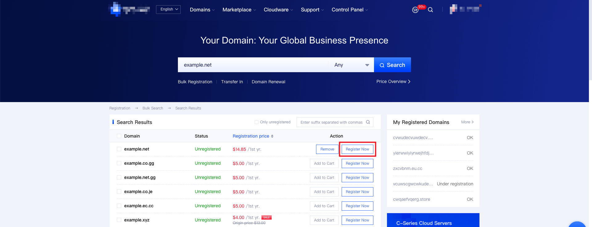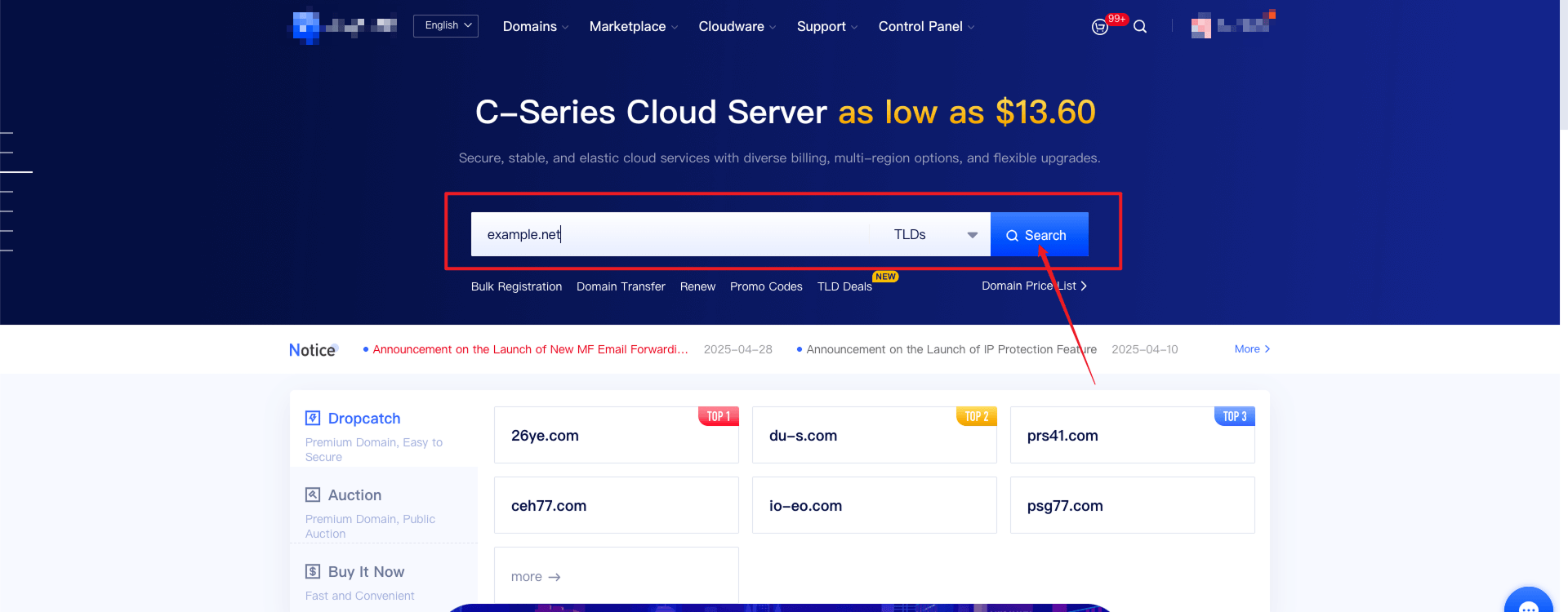 1. Log in to the homepage of our website, enter the domain name you wish to register, click on "Search", and proceed to the domain name search results page.
