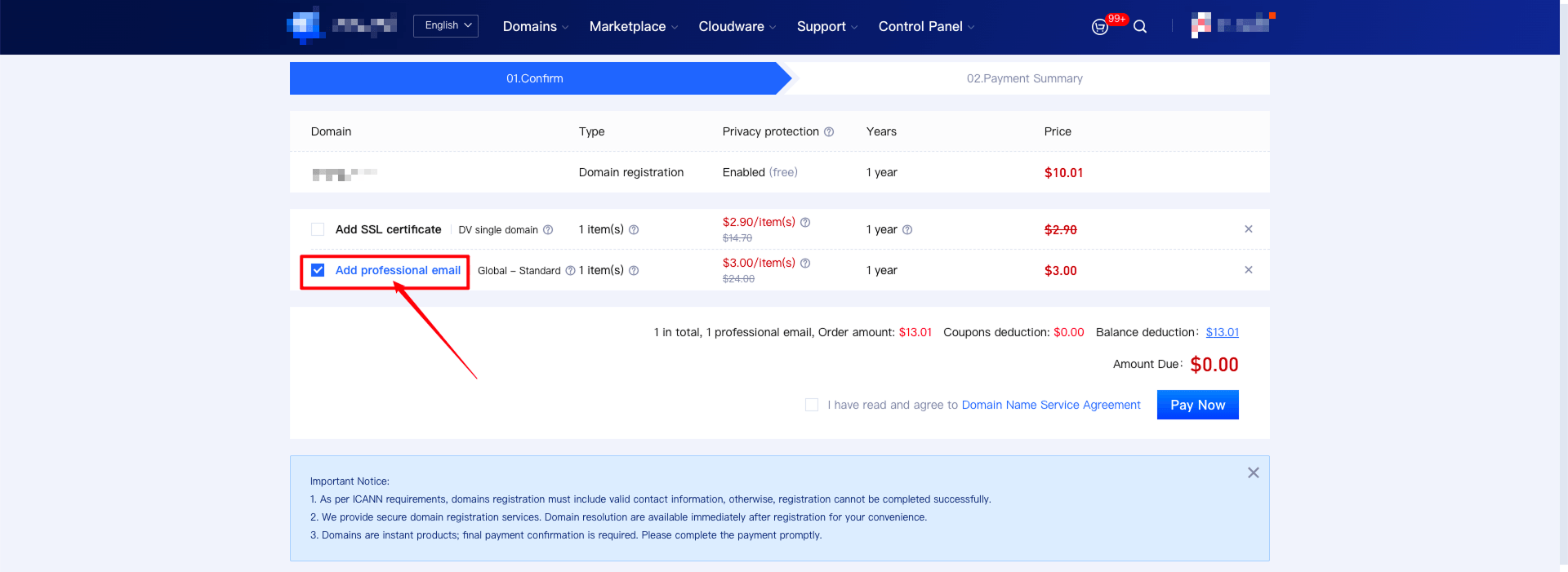 2. Click "Register Now" to enter the checkout page, select "Add Corporate Email" as an add-on, and click "Confirm Checkout" to complete your participation in purchasing the corporate email at the price of $3.00.