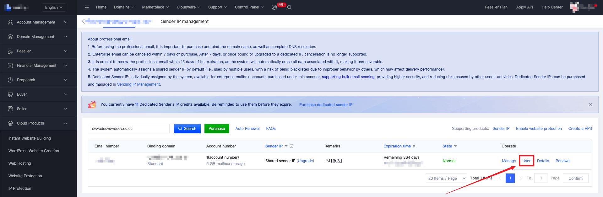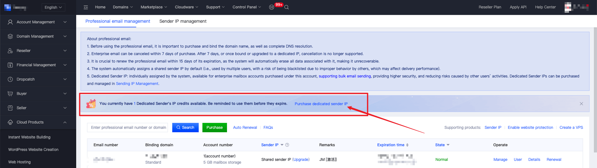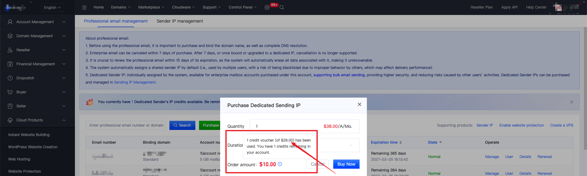 5. For the enterprise email account purchased this time, the system will give you a new purchase voucher worth $28.00 for a dedicated sending IP. Click "Purchase Dedicated Sending IP" and the system will automatically deduct $28.00.